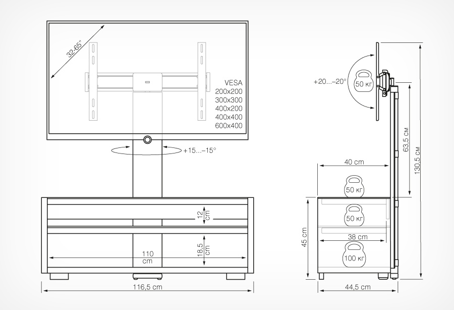 | Диагональ экрана | для ТВ с диагональю 32″ – 65″ |