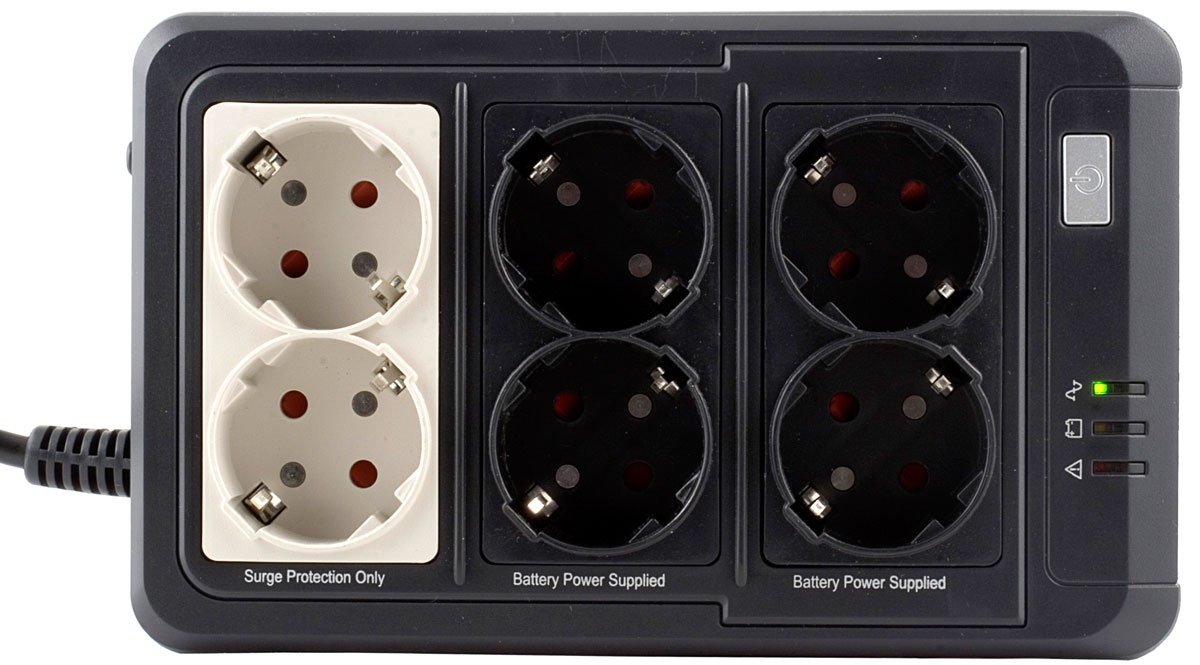 В верхней части ИБП находятся три светодиода индикации текущего режима работы. Справа от индикатора находится кнопка Power. На верхней панели находится блок из шести розеток типа Schuko.