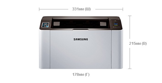 Этот компактный принтер занимает мало места и отлично смотрится на рабочем столе. Экономия места Небольшие размеры (33.2 x 21.5 см) позволяют назвать этот принтер самым компактным принтером от Samsung. Эргономичный дизайн Эргономичный дизайн, а также удачное сочетание светло-серого и темно-коричневого тонов корпуса придают принтеру современный и элегантный вид.