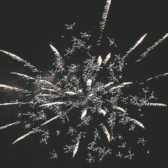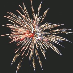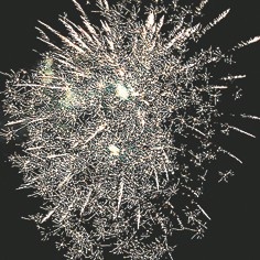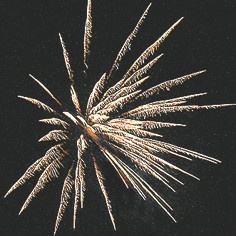 Яркие кометы разрываются белыми хвостами с треском, серебристыми сферами, золотыми хвостами с цветными звездами на концах, белыми трещащими сферами 40 - 50 сек., до 40 м.