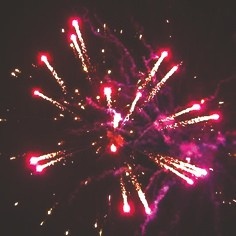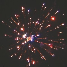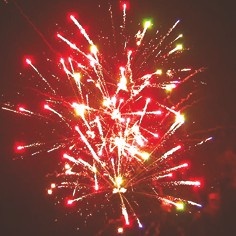 Цветные звезды разрываются красными и золотыми мерцающими звездами,синими и зелеными звездами с мерцанием,золотыми искристыми хвостами с красными звездами на конце и треском,золотыми искрящимися хвостами с фиолетовыми звездами на концах и мерцанием.Залп красных звезд разрывается золотыми искрящими хвостами с цветными звездами на концах.