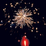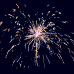 Золотые трещащие кометы разрываются сферами золотых ниспадающих, синих огней, красные звезды разрываются трещащими сферами 20 - 25 сек., до 25 м.