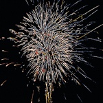 Стреляет очередями. Красно-синие сферы, цветные мерцающие салюты, яркие белые хвосты с мерцающими звездами, золотые мерцающие хвосты, серебристые трещащие хвосты. В конце трещащий залп 35 - 45 сек., до 30 м.