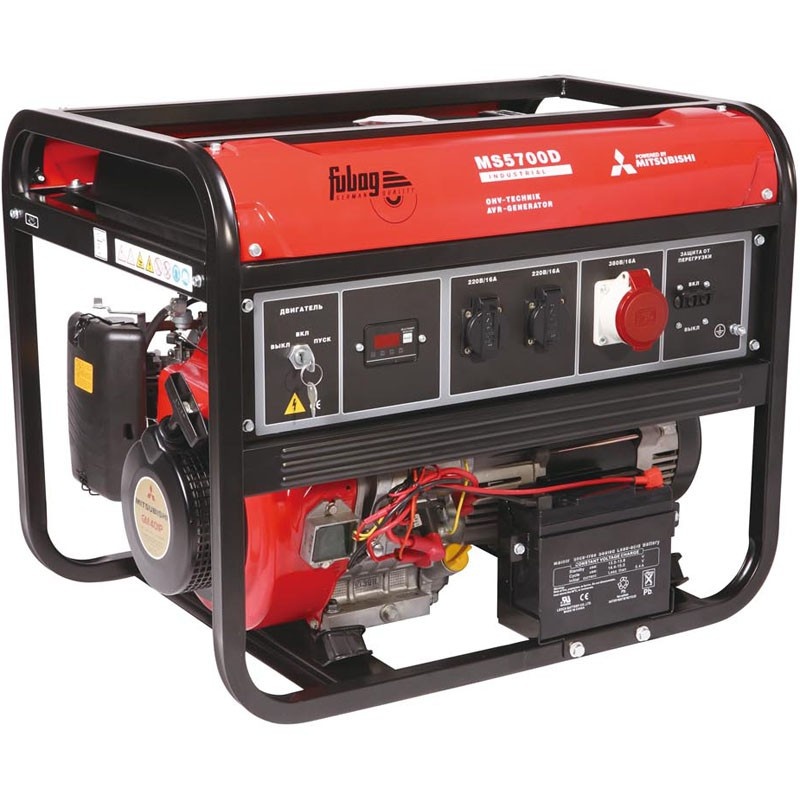 Электростанция Fubag MS 5700 D для профессионального использования с надежным OHV японским бензиновым двигателем MITSUBISHI мощностью 13 л.с. Оснащена многофункциональном дисплеем для контроля параметров работы, большим топливным баком с индикатором уровня топлива, защитой от перегрузок и системой отключения при низком уровне масла. Имеет усиленную раму для работ на стройке, русифицированную лицевую панель и электронную систему запуска двигателя (аккумулятор в комплекте). 2 розетки 220 В/ 16А, 1 розетка 380 В /16А.