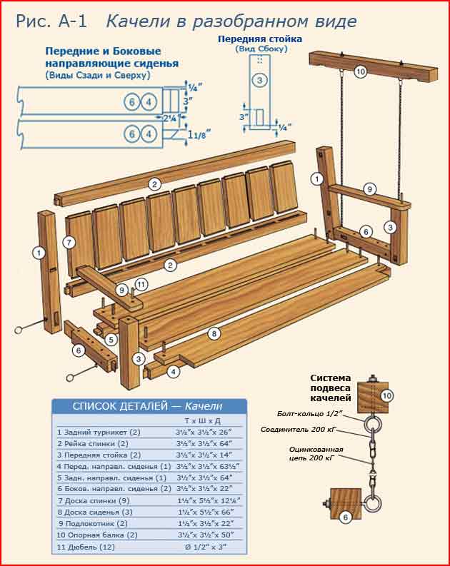 Итак, сначала необходимо определиться с дизайном и местом установки, решить, для кого именно предусмотрено сооружение, продумать его габариты и выбрать место для установки. Далее идет составление чертежа будущих садовых качелей, подбор инструментов и материалов.