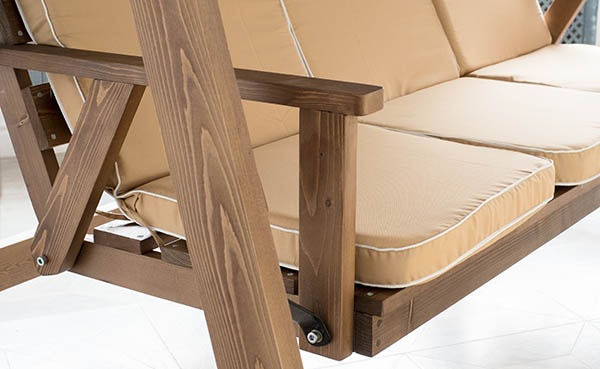 Все деревянные элементы тщательно обработаны специальными составами от иссыхания и влаги, а так же покрыты матовым лаком. У качели Floresta качественная фурнитура от немецкого производителя. Карельская сосна для этих качелей заготавливается в зимний период, а затем высушивается в финской сушильной камере.