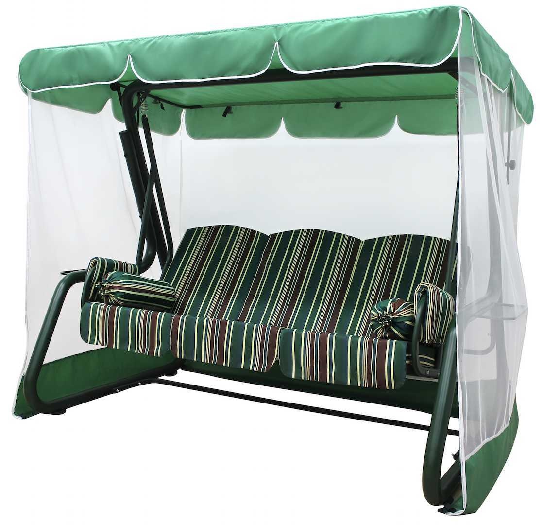 | Комплектация | 3 подушки-кресла (с оборкой, закругленный верх), тент с антимоскитной сеткой, 2 больших подлокотника, 2 подушки-валики, 2 подстаканника, 2 металлических тентодержателя с регулировкой наклона крыши |