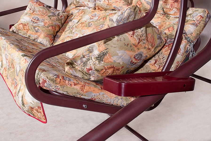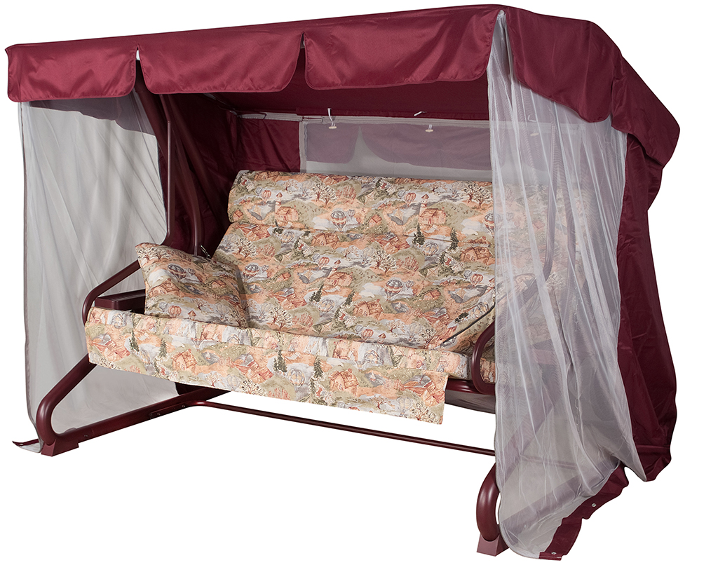Они имеют чрезвычайно привлекательный вид благодаря грамотному оформлению качелей. Качели бордо, как следует из названия, исполнены в бордово-кремовой гамме: каркас окрашен в глубокий, приглушенный бордовый цвет, тент более яркий, москитная сетка наполовину исполнена в том же цвете, что и тент, а вторая ее половина - нежного кремового цвета. Матрас и подушки исполнены из материала гобелен с красивым узором нежно-абрикосового цвета.
