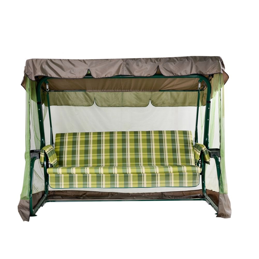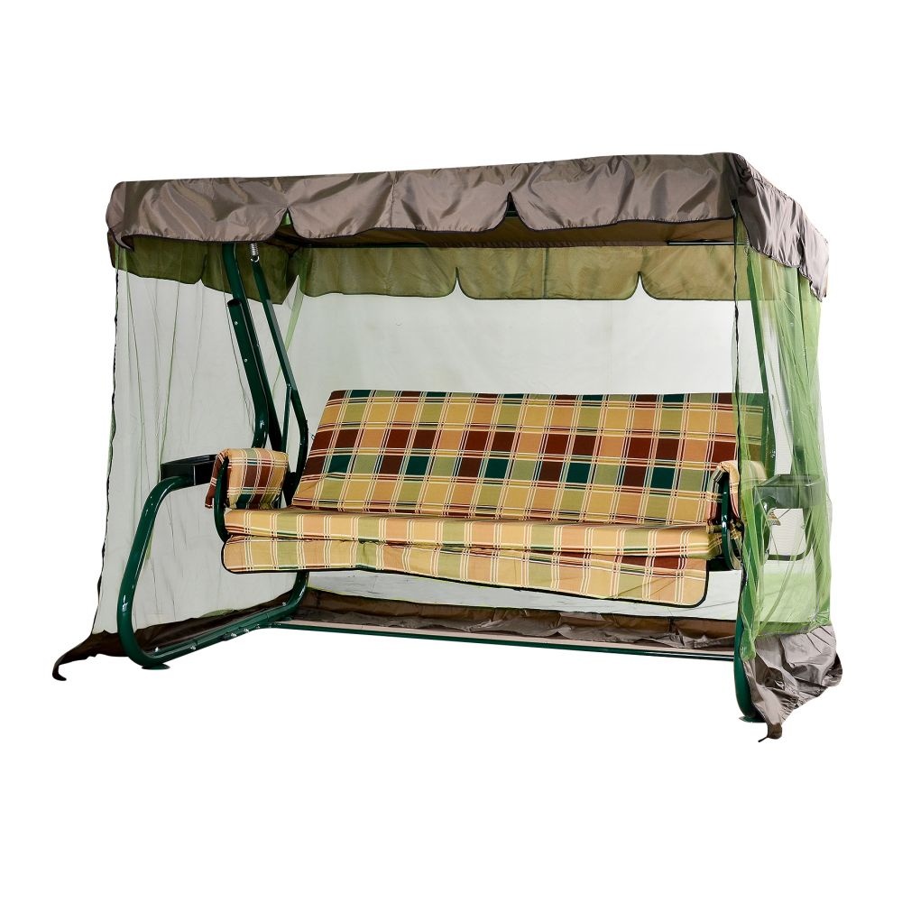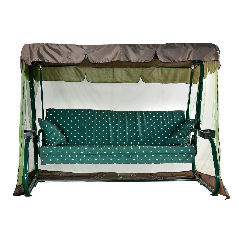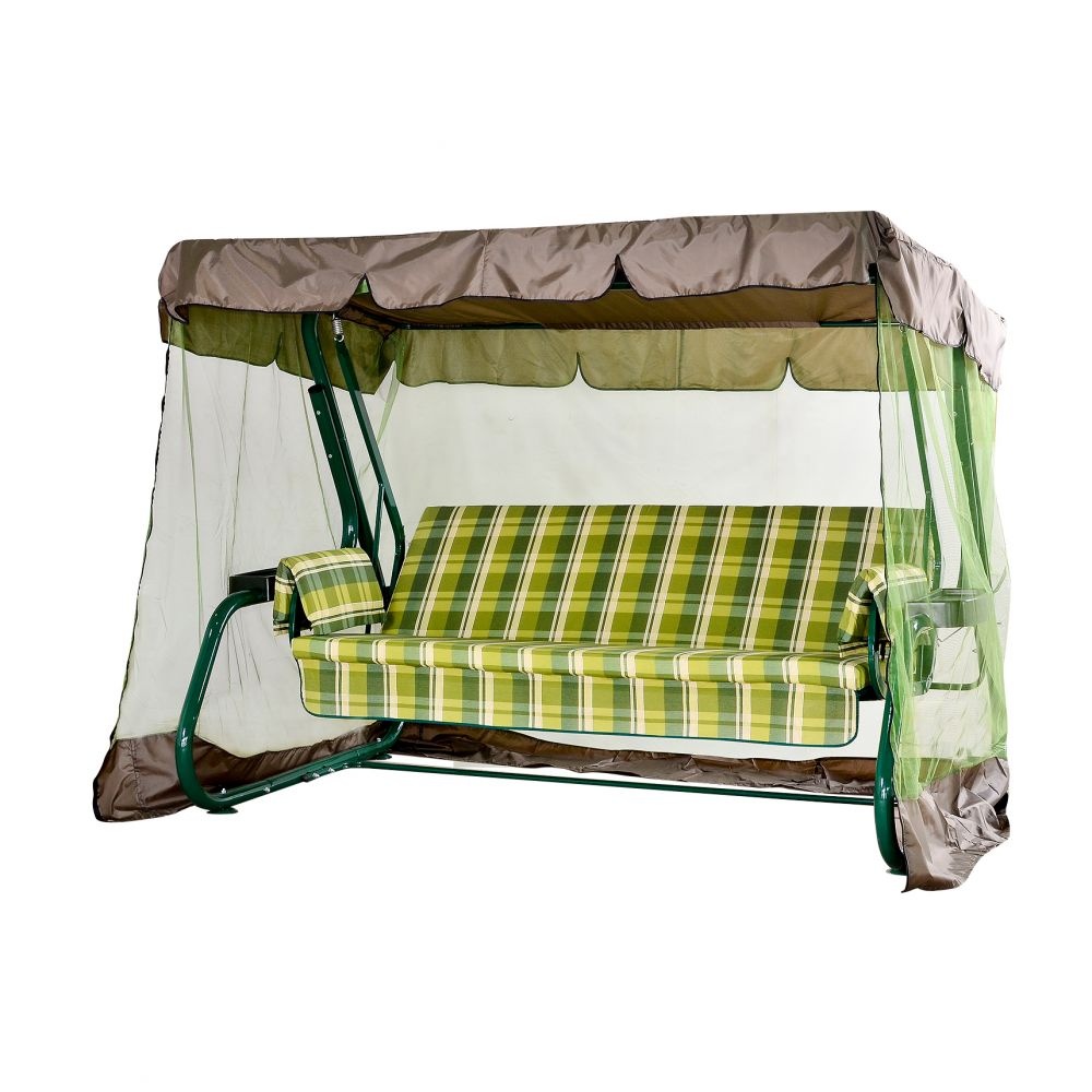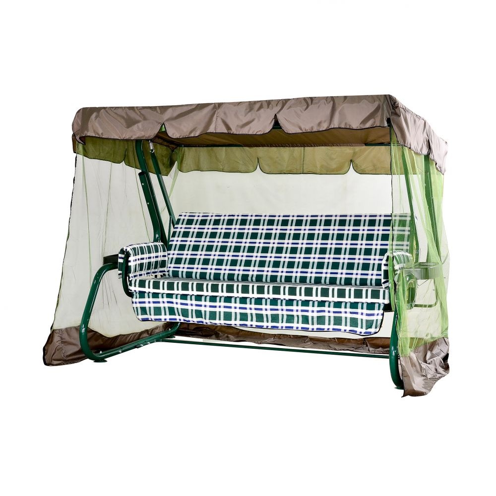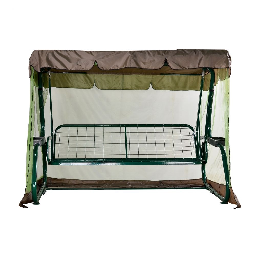 Качели выполняются в трех цветах – и вы можете выбрать, какой из них будет лучше сочетаться с декором вашего участка. Кроме того, к качелям прилагается большой тент, надежно защищающий от солнца, с противомоскитной сеткой, опустив которую, можно не опасаться позволяющий не опасаться оводов, слепней, комаров, мошек, ночных бабочек и других насекомых. Длина сиденья составляет 180 см.