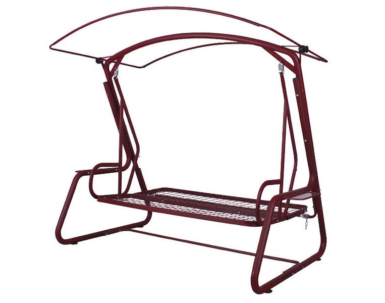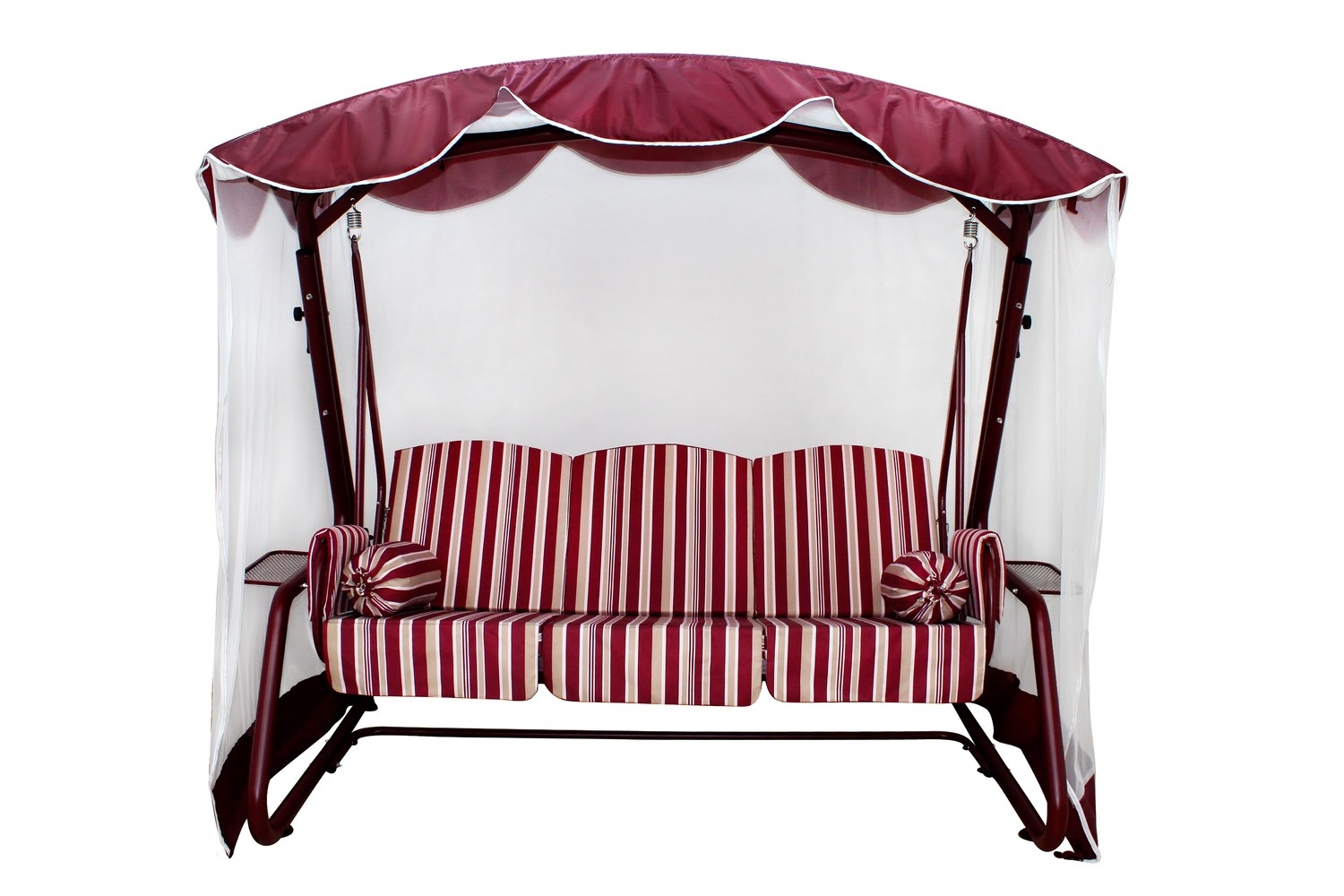 Дугообразная крыша садовых качелей Оазис совместно с тентом делают ее самой красивой моделью среди 3-х местных качелей.