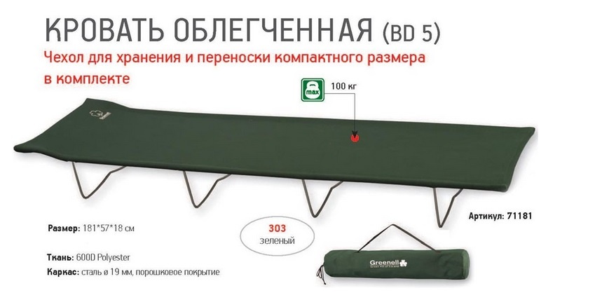 Она отлично заменит Вам «пенку» с надувным матрасом и сможет обеспечить полноценный сон. Такие раскладушки отличаются от домашних компактными размерами и маленьким весом. Так, например, кровать-раскладушка туристическая Greenell BD-5 в сложенном виде помещается в небольшой чехол.
