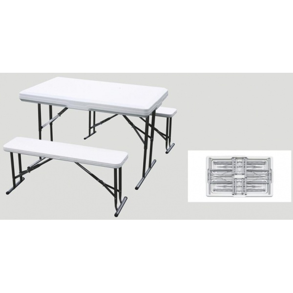 Отличается повышенной прочностью и удобным методом складывания (лавки убираются в столешницу и фиксируются с помощью ее сложенных телескопических ножек)