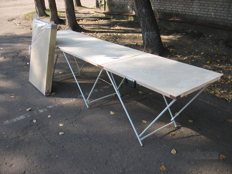 Конструкция стола включает в себя три одинаковые части, представляющие собой соединенные вместе три столика из фанеры толщиной 3 мм с ножками из стальной трубы D 16 мм, выполненными в виде треугольника. Стол имеет ручку для переноса.