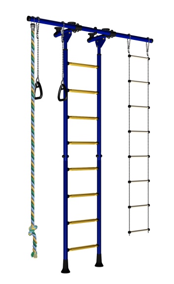 Крепится враспор между полом и потолком это очень удобно тем, что подходит для любых стен, и комплекс просто собрать и установить.