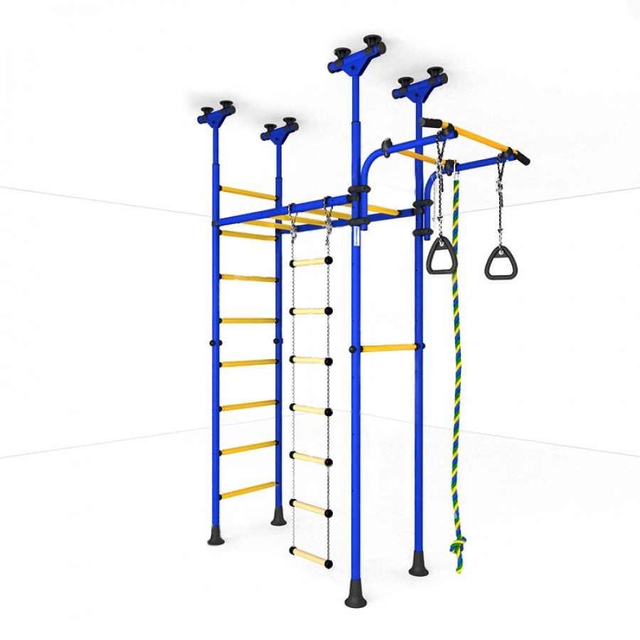 Комплекс представляет собой сборно-разборную металлическую конструкцию. Крепится враспор между полом и потолком. Удобно тем что подходит для любых стен, и комплекс можно передвигать с места на место. Но потолок не должен быть из хрупких материалов, таких как гипсокартон (навесные потолки) и вагонка, для них лучше подойдут пристенные модели.