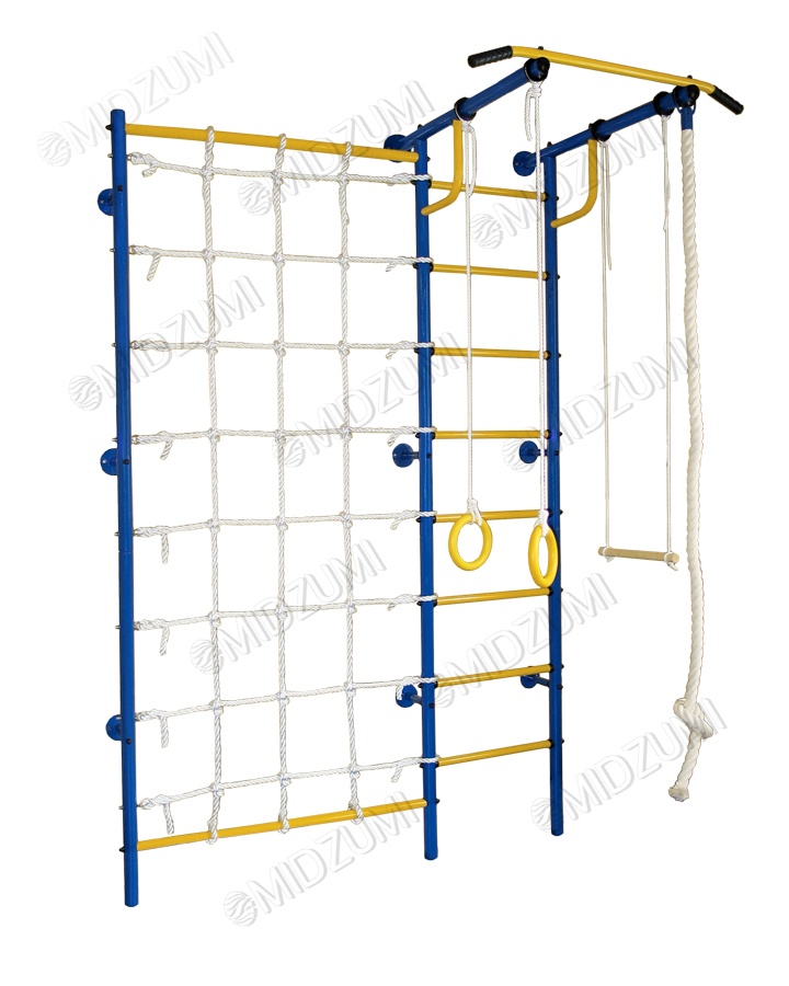 Металлическая шведская стенка Midzumi Kokeika имеет турник с большим выносом от самой стенки. Благодаря такому дизайну появляется возможность добавить в комплекс навесное оборудование такое как канат, кольца и трапеция. Дополнительно к шведской стенке крепится канатный лаз. Канатная сетка шириной в 1 м. расширяет место для увлекательных приключений. Ее можно установить справа или слева от шведской стенки. Дети очень увлекаются игрой на шведской стенке, особенно интересно когда есть возможность перепрыгивать с одного снаряда на другой.