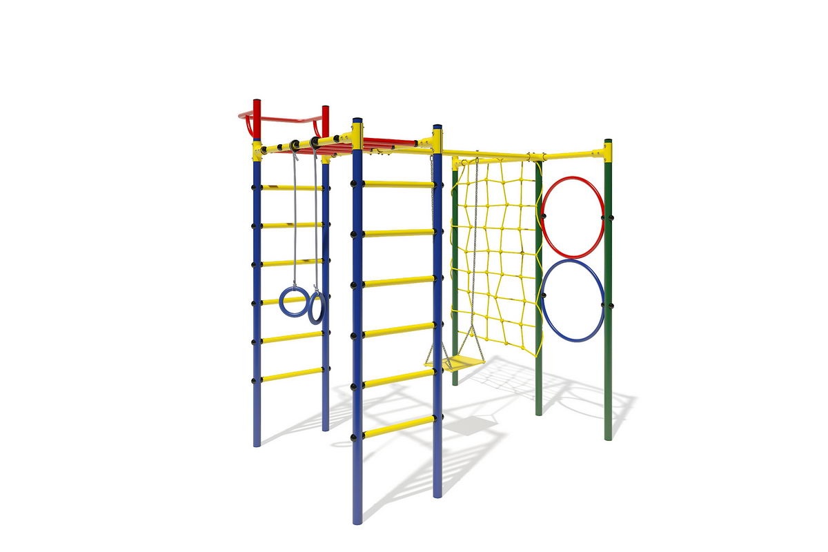 В комплект входят турник, гимнастические кольца, цепочные качели и сетка для лазания.