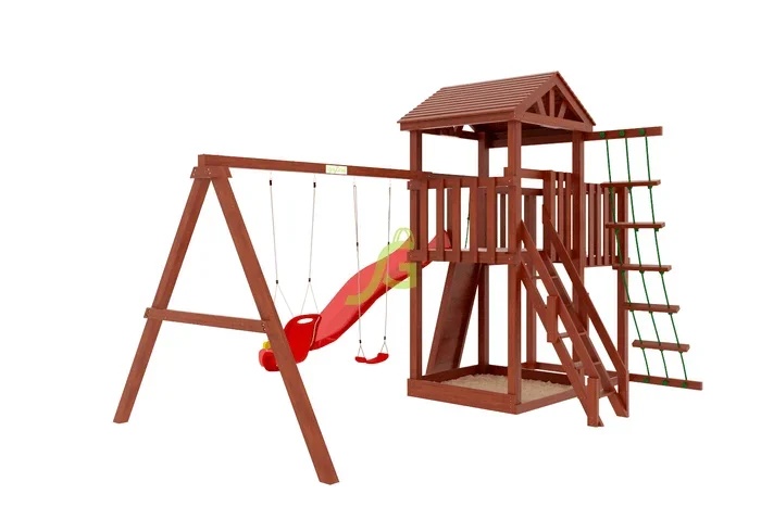 На первом уровне расположилась удобная песочница, в которой можно играть даже при активном солнце, ведь конструкция надёжно защищена деревянной крышей. Второй уровень - это просторный балкон и площадка, откуда открывается отличный обзор на весь участок. Детское воображение обязательно придумает множество полезных занятий и игр, которые можно реализовать на балконе. Верёвочная лестница точно понравится ребятам постарше. Взбираясь по ней, ребёнок будет развивать координацию и укреплять мышцы, а само упражнение станет захватывающим приключением в очередной ролевой игре. Скалодром - отличное дополнение для ещё более активных игр. Вскарабкаться по нему наверх не так просто, как может показаться вначале, однако ваш малыш справится с задачей и будет очень гордиться собой. Качели - классическое развлечение, которое любят дети всех возрастов. Расположенные на отдельном модуле, качели не пересекаются с остальными элементами и обеспечивают максимальную безопасность для ребёнка.