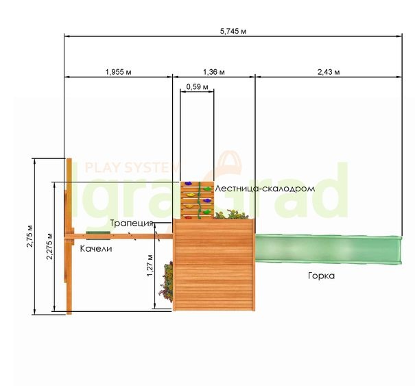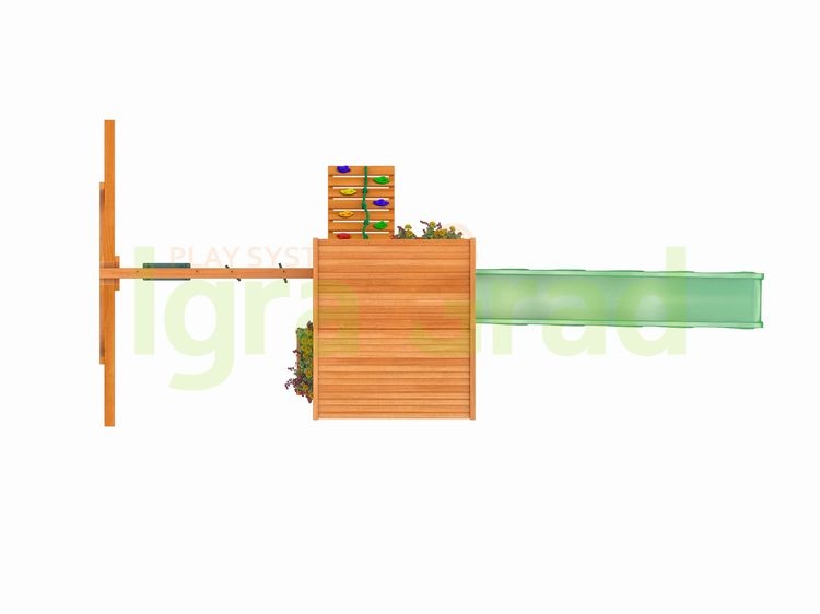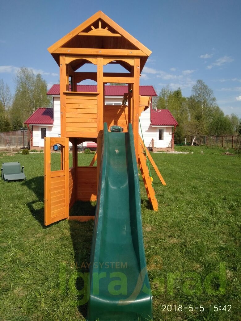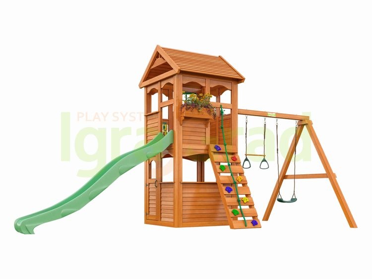 | ДСК включает | закрытый двухуровневый игровой домик с дверью, деревянной крышей, деревянное кашпо, волновая горка S-line 3 м, деревянная лестница-скалодром, канат, качельный модуль, пластиковые одиночные качели (1 шт.), трапеция с кольцами (1 шт.), доска для игры в “Крестики-нолики”, пластиковое окошко, комплект фурнитуры, руководство по сборке |