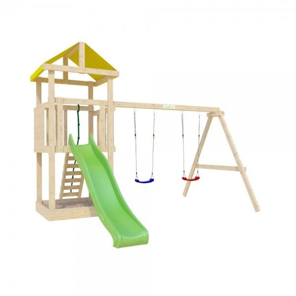 | Комплектация | конструкция двухуровневой башни, тентовая крыша, волновая горка Yulvo 2,2 м, деревянная лестница - скалодром, канат, качельный модуль, пластиковые одиночные качели (2 шт.), комплект фурнитуры, комплект инструмента (свёрла, биты), шаблон для присадки (сверление отверстий), руководство по сборке |