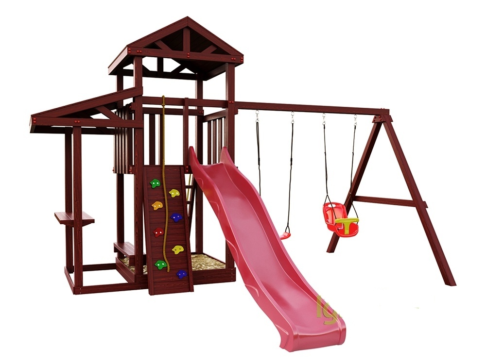 Конструкция игрового комплекса для дачи сборная. Каждый покупатель имеет возможность собрать детскую игровую площадку своими руками во дворе. Все детали игровой площадки изготовлены из сосновой древесины, стойки выполнены из клееного бруса 90 х 90,пропитанны антисептическим раствором, тщательно отшлифованы и покрыты лаком.