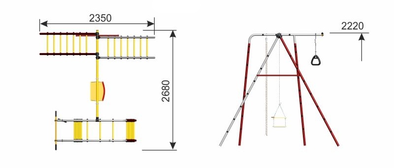 Верхняя труба: 50,8x2 мм. Опоры: 45x1,5 мм. Боковые трубки: 25,4x1,0 мм. Размеры в собр. виде (ДхШхВ): 308х156х196 см. Комплекс включает в себя: двухместные качели, качели.