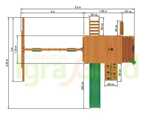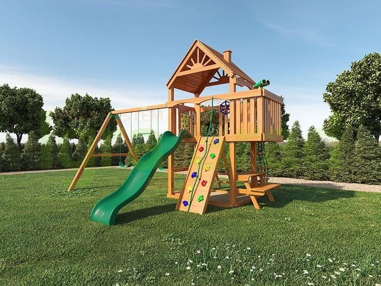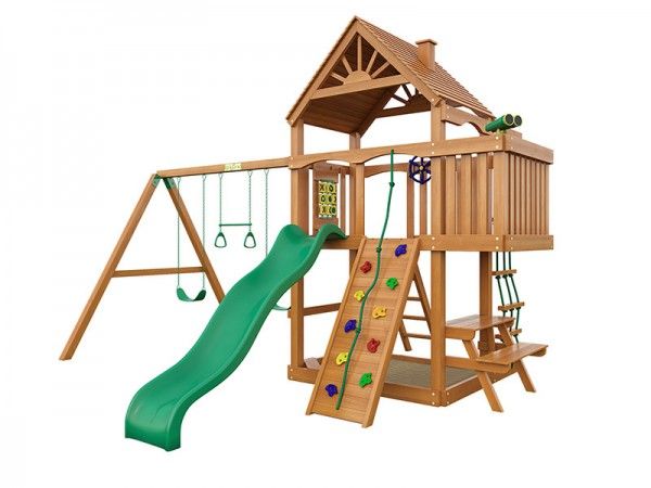 | Комплектация | двухуровневый домик, волновая горка (США), веревочная лестница, деревянная лестница, конструкция скалодром с камнями, качельный модуль, гибкие качели на цепях в резиновой оболочке (2 шт.), трапеция с кольцами на цепях в резиновой оболочке, комплект пластиковых ручек, доска для игры в “Крестики-нолики”, лавочка-столик, песочница, бинокль/телескоп, руль/штурвал, крепежный элемент "Якорь" (2 шт.), комплект фурнитуры, руководство по сборке |