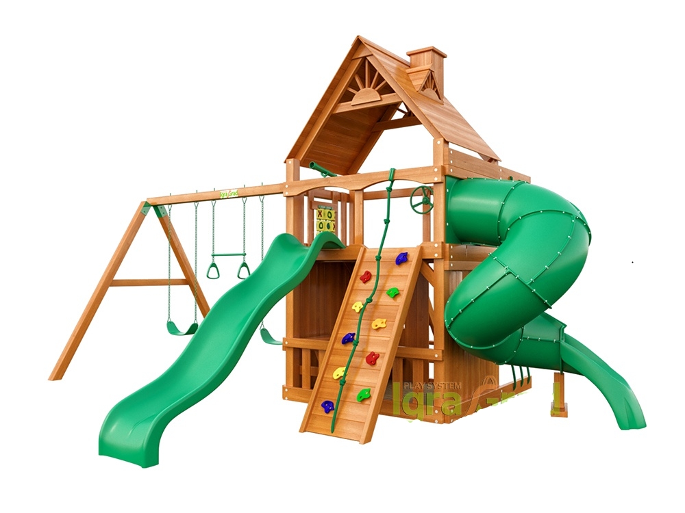 Детская площадка из дерева оборудована двумя горками для спуска: одна из них открытая с волнистой поверхностью, вторая имеет вид закрытой изогнутой трубы из пластика. Качельный модуль детского комплекса предусматривает две качели на прочных цепях с удобными открытыми сиденьями. Между качелями крепится трапеция с кольцами, которая полностью повторяет взрослый спортивный снаряд.