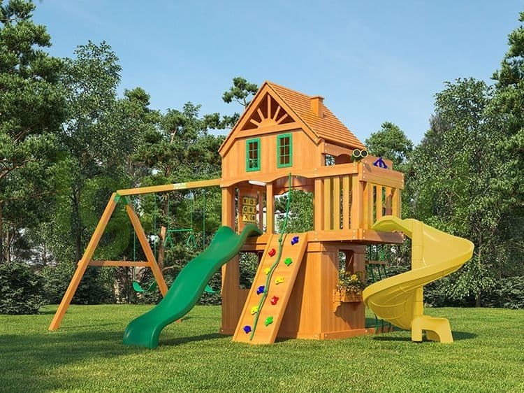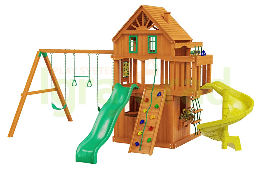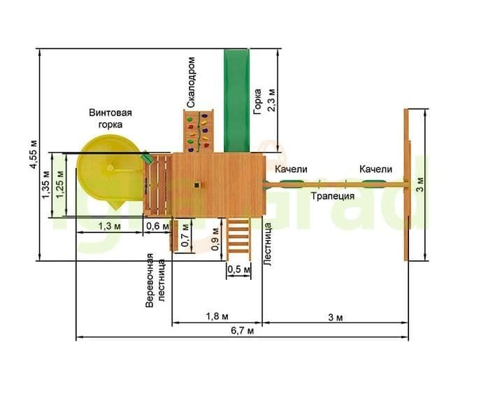 | Комплектация | двухуровневый домик с красивыми пластиковыми окошками, волновая горка (США), горка-спираль с высоты 1,5 м, веревочная лестница, деревянная лестница, конструкция скалодром с камнями, качельный модуль, гибкие качели на цепях в резиновой оболочке (2шт.), трапеция с кольцами на цепях в резиновой оболочке, комплект пластиковых ручек, доска для игры в “Крестики-нолики”, лавочка-столик, песочница, бинокль/телескоп, руль/штурвал, крепежный элемент ""Якорь"" (2 шт.), комплект фурнитуры, руководство по сборке |