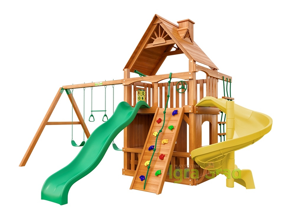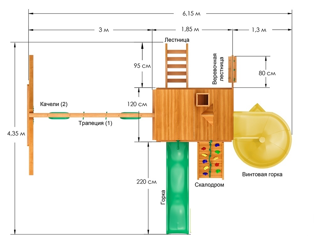 | Комплектация | двухуровневый домик, стойки из клееного бруса 100х100; конструкция скалодром с камнями; волновая горка; винтовая горка; веревочная лестница; деревянная лестница; гибкие качели на цепях в резиновой оболочке (2 шт.); комплект пластиковых ручек; трапеция с кольцами на цепях в резиновой оболочке; доска для игры в “Крестики-нолики”; лавочка; столик; бинокль; руль; крепежный элемент "Якорь" (2 шт.); песочница; комплект фурнитуры; руководство по сборке |