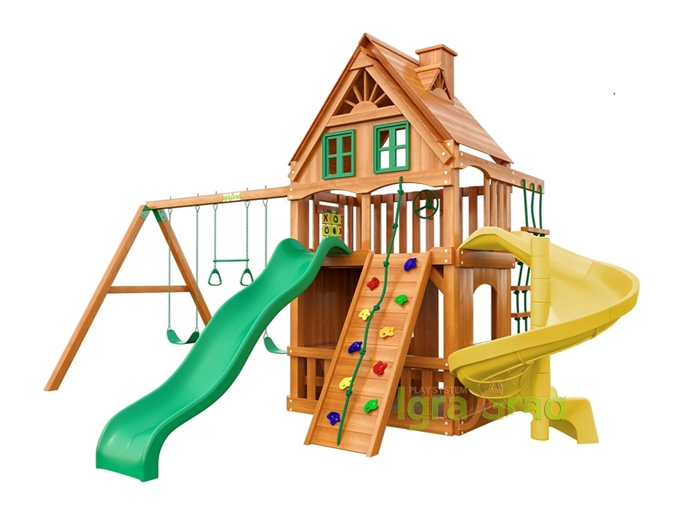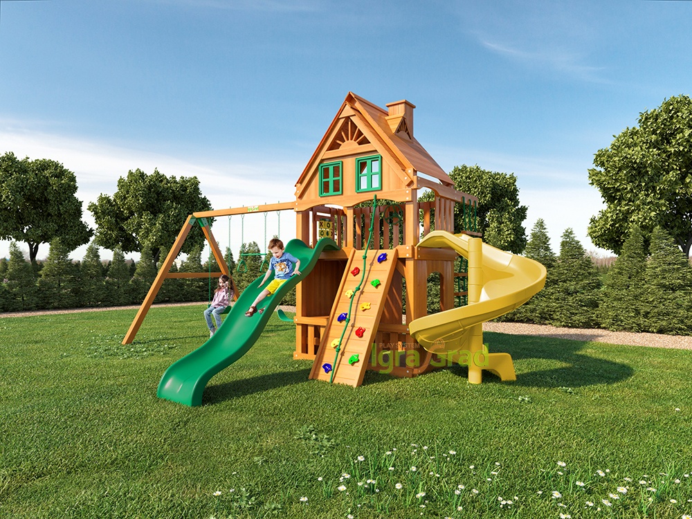 | Комплектация | двухуровневый домик, стойки из клееного бруса 100х100, с красивыми пластиковыми окошками; конструкция скалодром с камнями; волновая горка; винтовая горка; веревочная лестница; деревянная лестница; гибкие качели на цепях в резиновой оболочке (2 шт.); комплект пластиковых ручек; трапеция с кольцами на цепях в резиновой оболочке; доска для игры в “Крестики-нолики”; лавочка; столик; бинокль; руль; крепежный элемент "Якорь" (2 шт.); песочница; комплект фурнитуры; руководство по сборке |