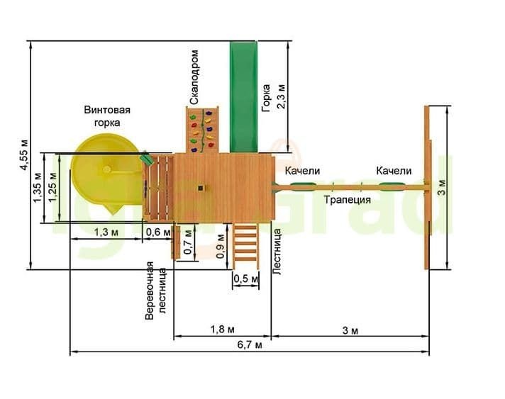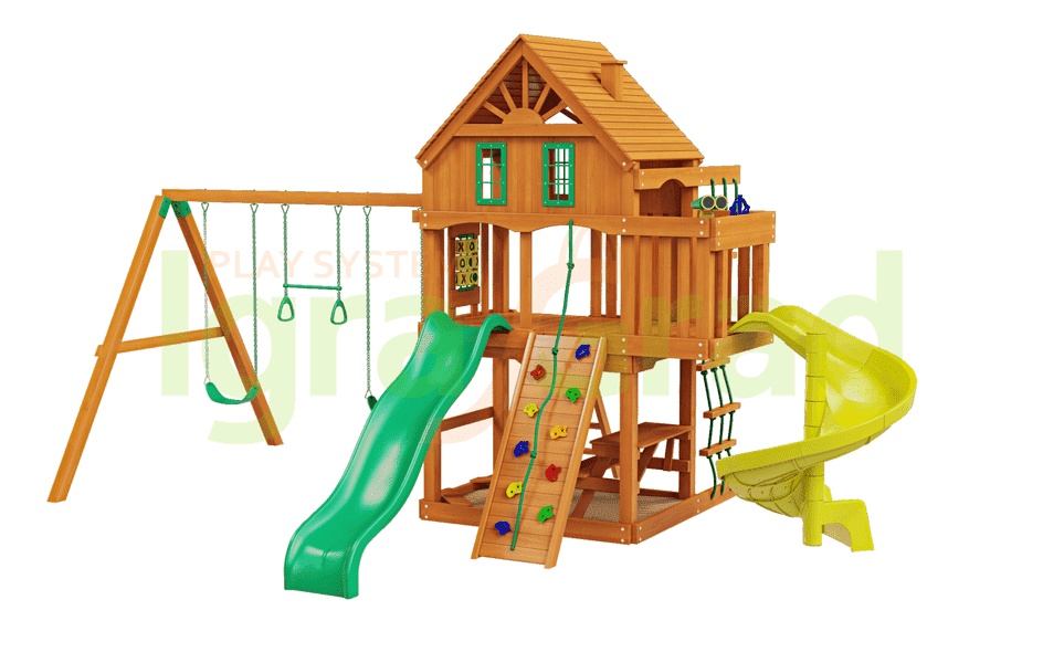 | Комплектация | двухуровневый домик с красивыми пластиковыми окошками, волновая горка (США), горка-спираль с высоты 1,5 м, веревочная лестница, деревянная лестница, конструкция скалодром с камнями, качельный модуль, гибкие качели на цепях в резиновой оболочке (2шт.), трапеция с кольцами на цепях в резиновой оболочке, комплект пластиковых ручек, доска для игры в “Крестики-нолики”, лавочка-столик, песочница, бинокль/телескоп, руль/штурвал, крепежный элемент ""Якорь"" (2 шт.), комплект фурнитуры, руководство по сборке |