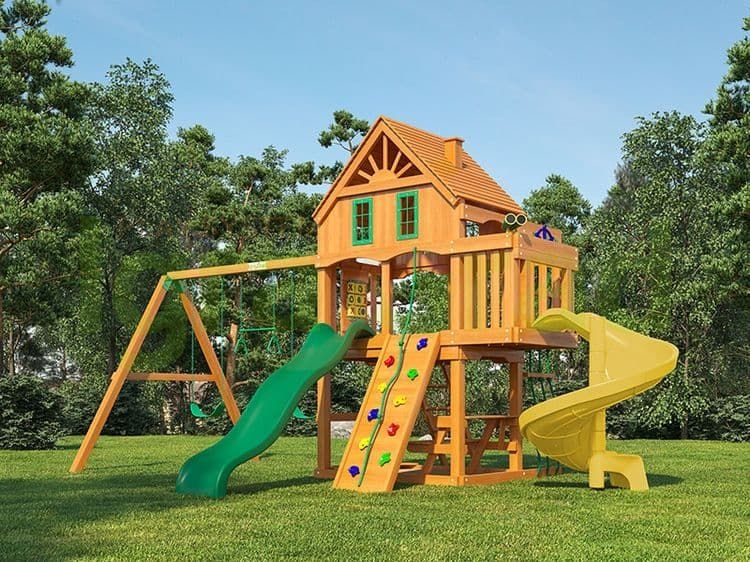 Усиленная детская площадка изготовлена из качественной древесины, окрашена в приятный солнечный цвет, окошки окрашены в зелёный. Разноцветные комплектующие элементы помогают запомнить цвета. Благодаря обработанному пиломатериалу дети не занозят пальчики. Комплектующие детали приходят от надёжного американского производителя.