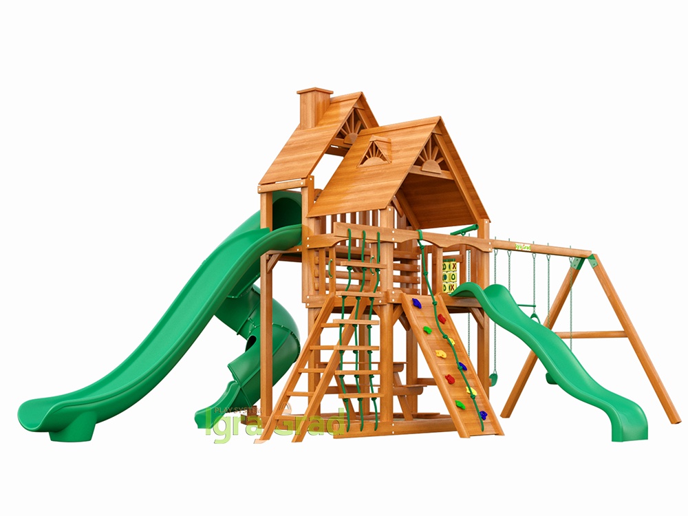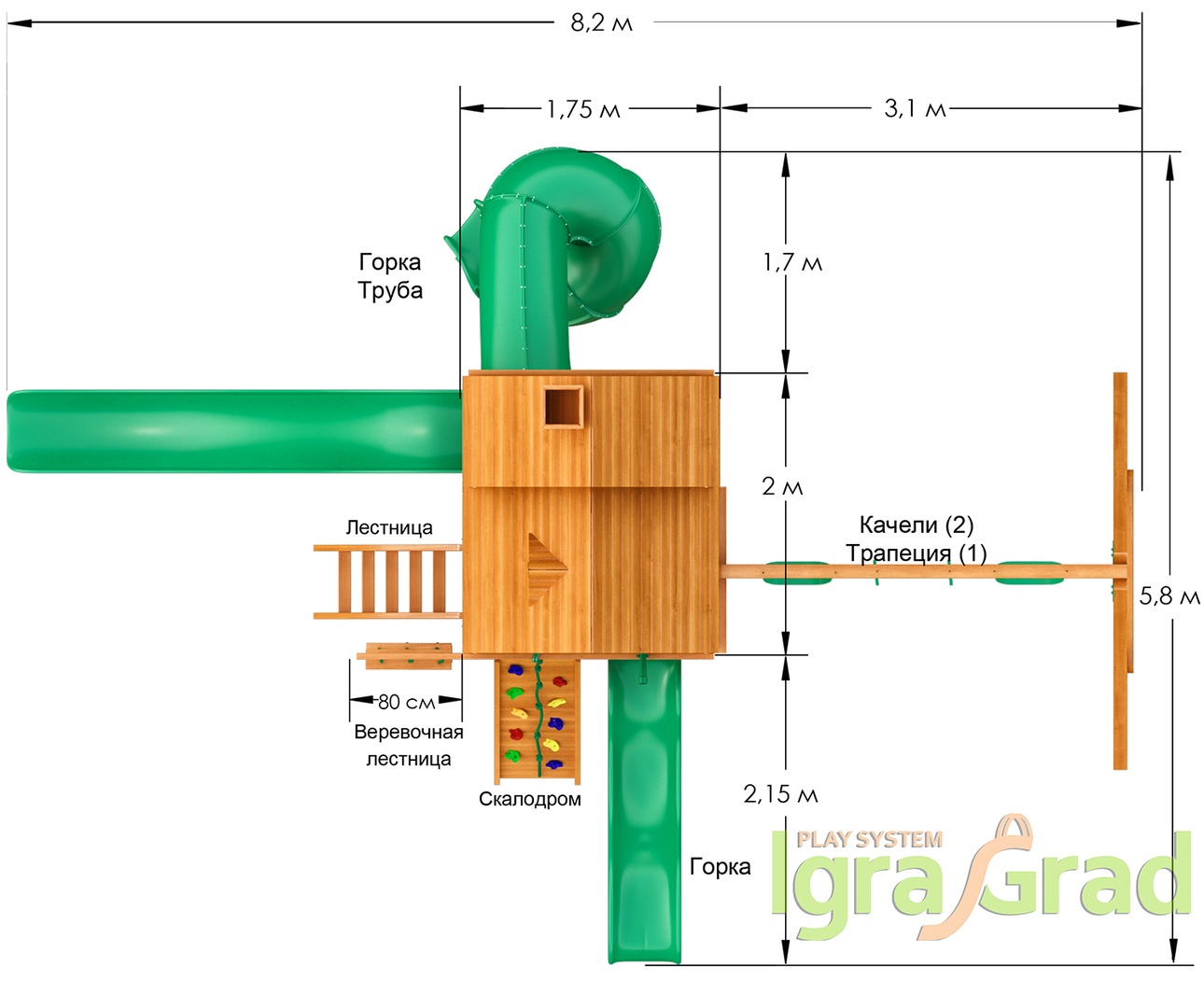 | Комплектация | двухуровневый домик, стойки из клееного бруса 100х100; конструкция скалодром с камнями; волновая горка; горка труба; волновая горка LUX 2.1м; веревочная лестница; деревянная лестница; гибкие качели на цепях в резиновой оболочке (2 шт.); комплект пластиковых ручек; трапеция с кольцами на цепях в резиновой оболочке; доска для игры в “Крестики-нолики”; лавочка; столик; бинокль; руль; крепежный элемент "Якорь" (2 шт.); песочница; комплект фурнитуры; руководство по сборке |