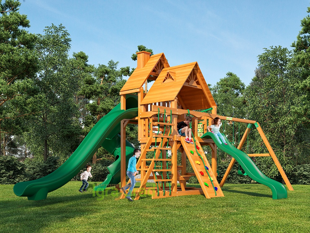 В конструкцию деревянной детской площадки входят интересные горки: горка-труба закрытого изогнутого типа, открытые горки. Они изготовлены из прочного пластика высокого качества, соответствующего стандартам экологической безопасности.