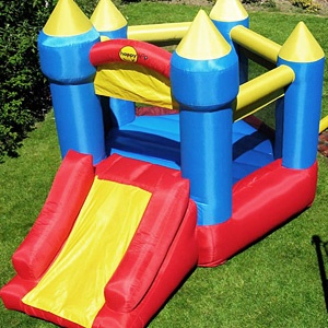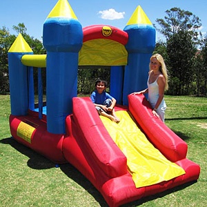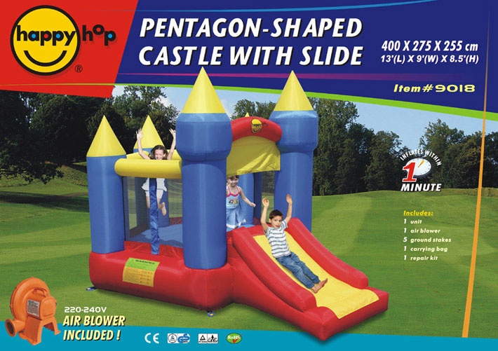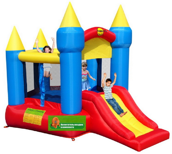 Имеет четыре надувные башни, две передние повыше, задние пониже. Комфортный надувной пол позволяет скакать и прыгать неуставая. Ну и конечно надувная горка для спуска с высоты.