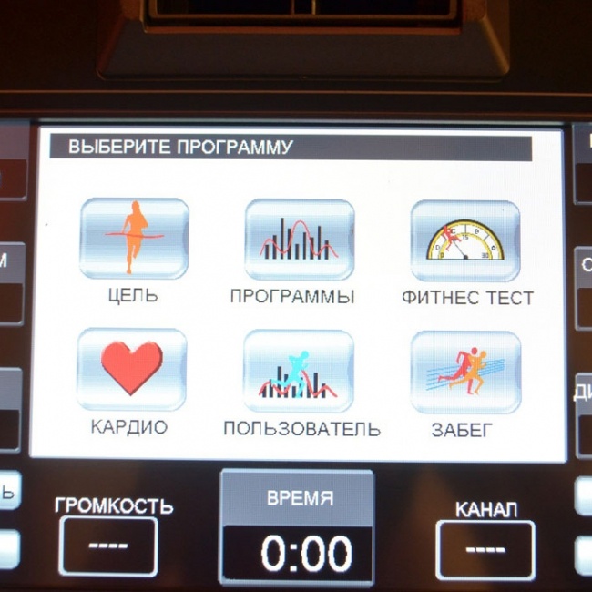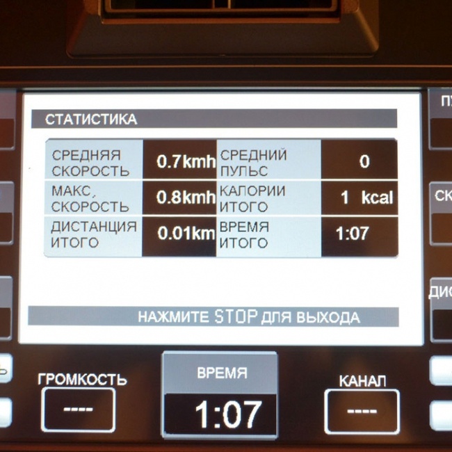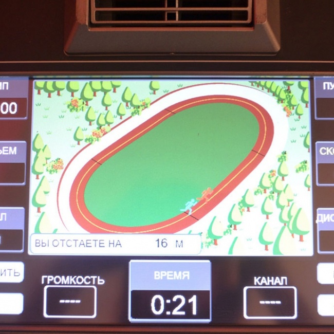 На дисплее отображается информация о пульсе, скорости, пройденной дистанции, калориях, подъеме, темпе, времени тренировки, ТВ каналах, громкости