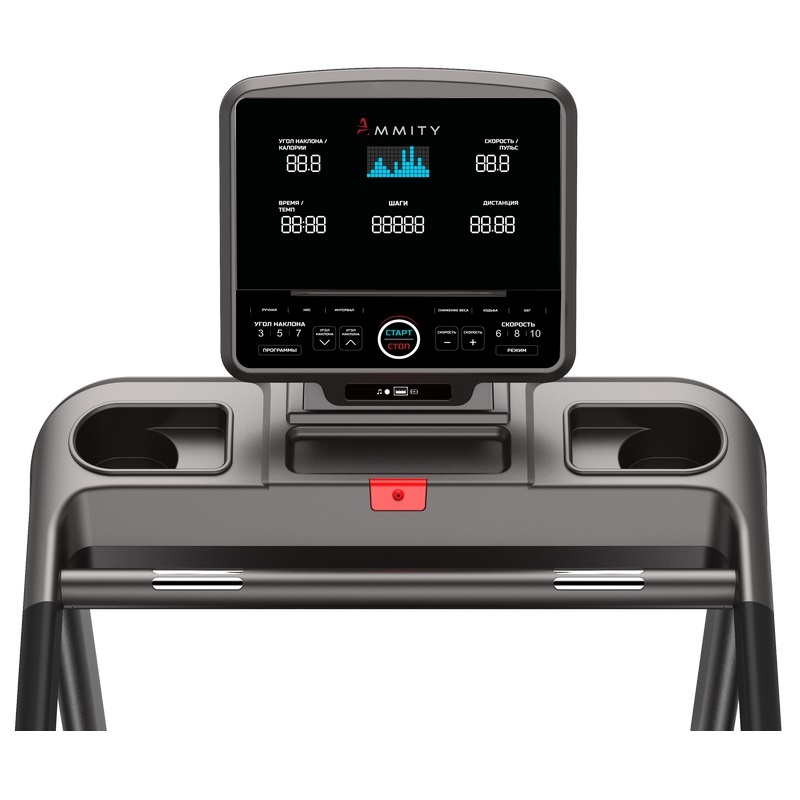 Консоль управления: функциональная, русифицированная панель, удобный экран состоит из 5 LED окон и LCD дисплея, помимо основных параметров: скорость, угол наклона, калории, время, дистанция – отображает количество шагов. Оптимизированный пакет программ включает целевые тренировки, тест BMI, пульсозависимые программы и 11 встроенных программ. Встроенная система мультимедия поддерживает формат MP3, консоль оборудована 2 динамиками. Также есть USB Charger, для подзарядки гаджетов во время занятий.