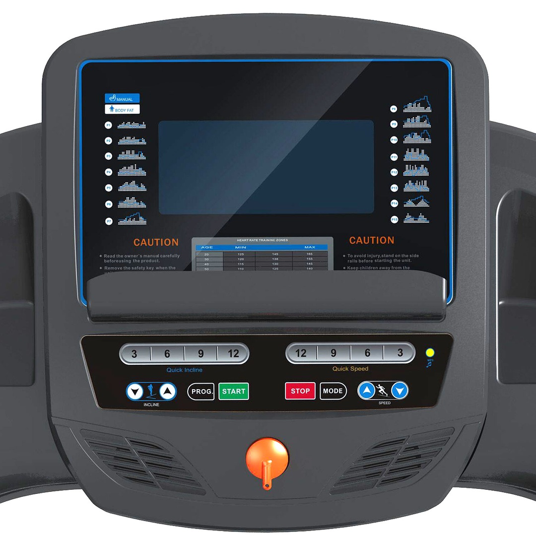 Кнопки изменения скорости и угла наклона бегового полотна, датчики пульса на поручнях. Вход для MP3-плеера с 2-мя встроенными динамиками.