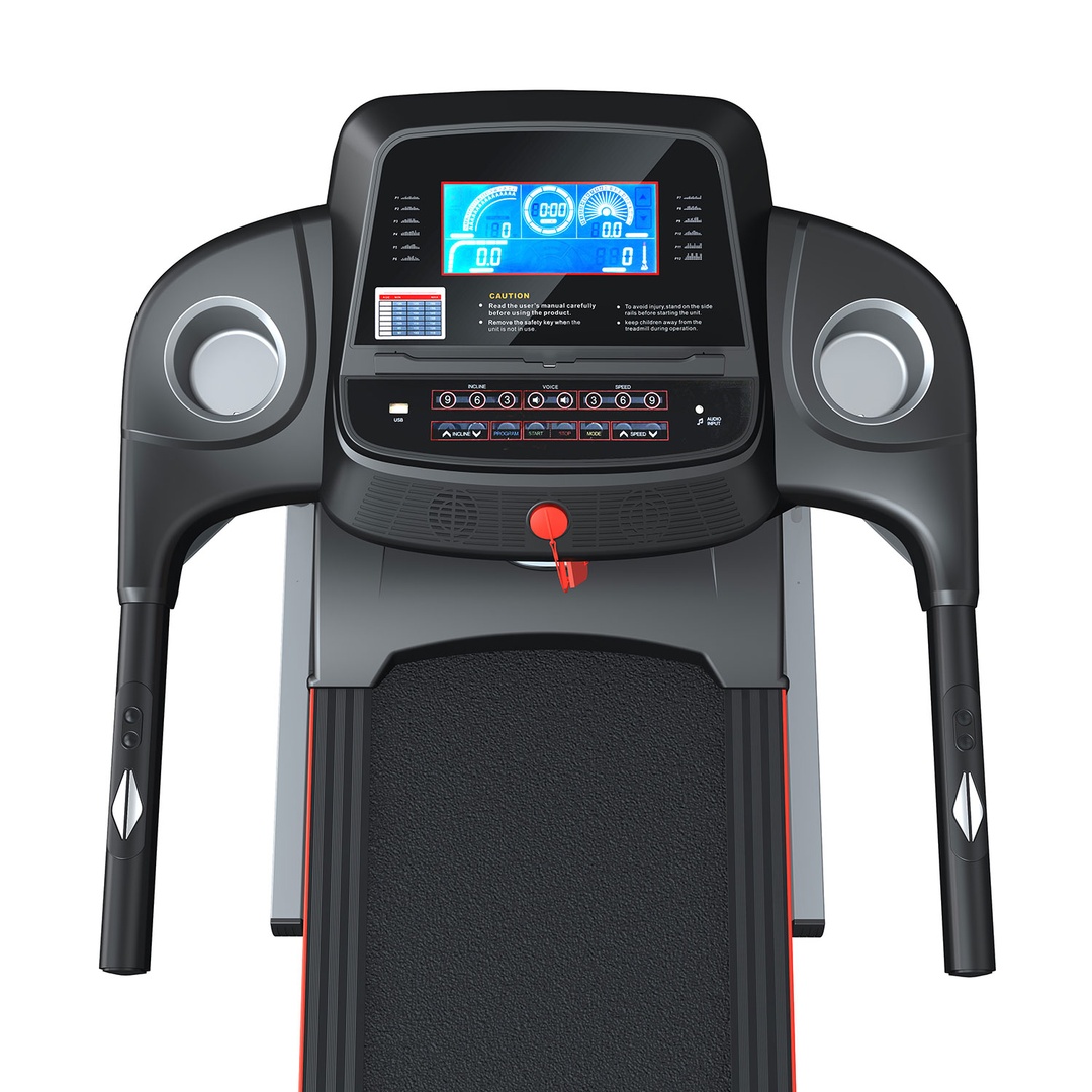 Консоль беговой дорожки оснащена LCD-дисплеем размером 7 дюймов с голубой подсветкой, отображает всю необходимую пользователю информацию во время тренировки: скорость, пройденное расстояние, сжигаемые калории, частоту пульса.