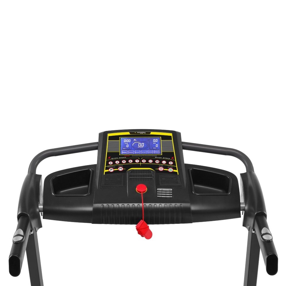 Контактные датчики на рукоятках выводят показания пульса на экран. Беговая дорожка оснащена гидравлической системой складывания, способствующей легкому и безопасному подъему и опусканию бегового полотна. Для управления режимами тренировки в модели предусмотрен инфракрасный пульт дистанционного управления.