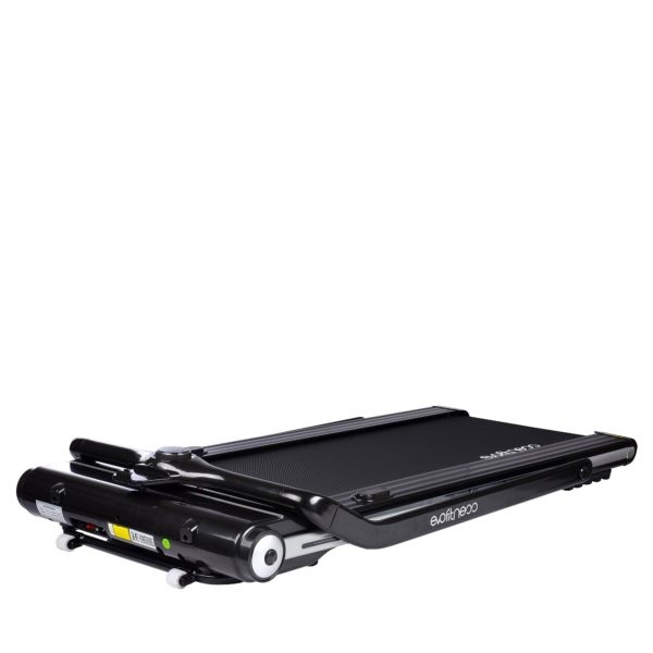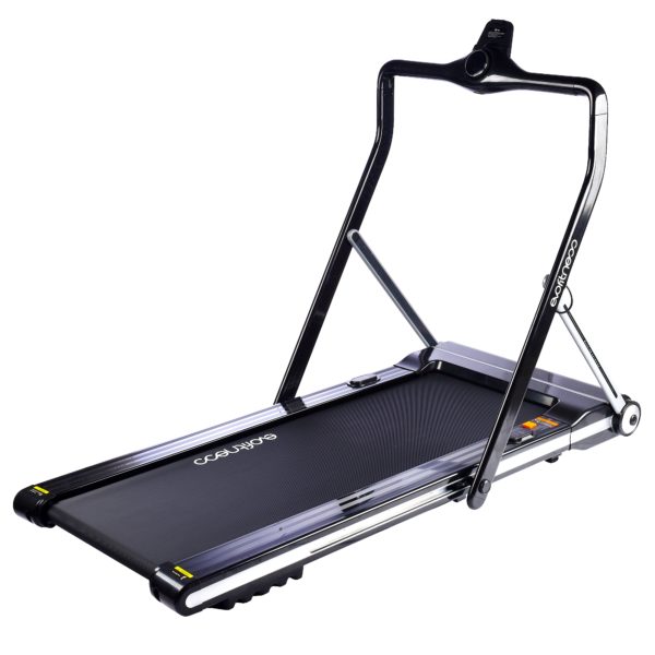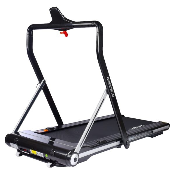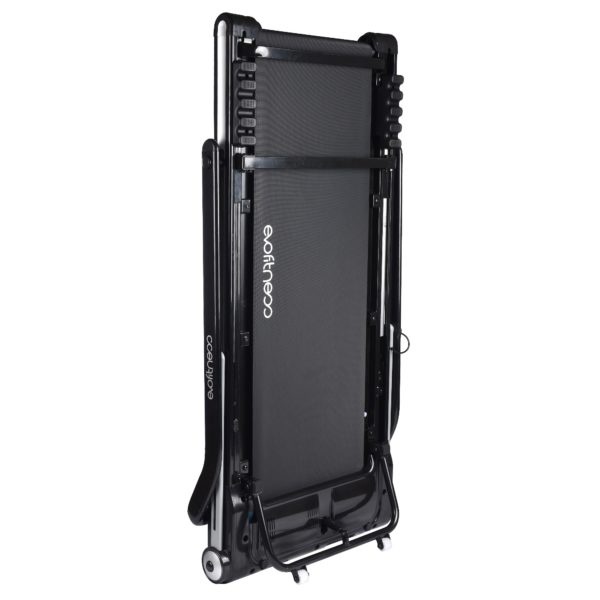 Беговая дорожка имеет стильный футуристический дизайн, который идеально впишется в любой интерьер. Тренажер оснащен уникальной, простой в использовании, системой складывания, которая существенно экономит полезное пространство в квартире. Занимаемая площадь беговой дорожки в сложенном виде в 3 раза меньше по сравнению с беговыми дорожками с обычной системой складывания. Боковые стойки и консоль подвижные и позволяют сложить их в одной плоскости.