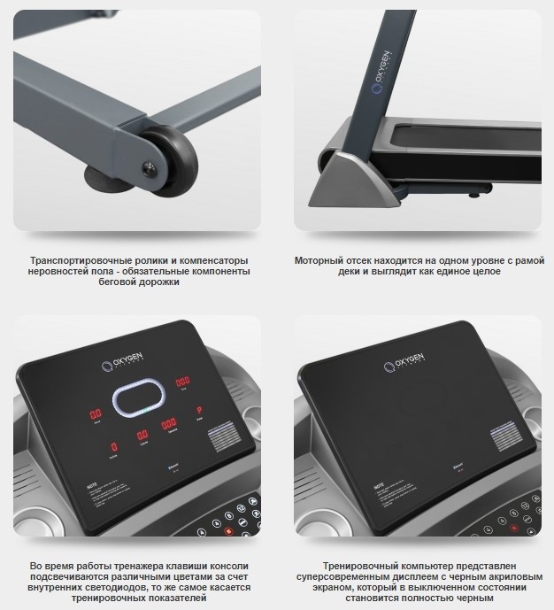 Коллекция TECHNO от немецкого бренда OXYGEN FITNESS™ - это сочетание современного индустриального дизайна, передовых технических решений и сбалансированных эксплуатационных характеристик. Внешний вид выполнен в рамках перспективной концепции Flattex™. В основе этой дизайнерской идеи лежит принцип минимализма и сглаживания линий. Так, к примеру, моторный отсек является продолжением рамы деки, находится с ней на одном уровне и выглядит как единое целое. Тренировочная консоль обладает ровной, гладкой формой, абсолютно все клавиши сенсорные. Главный дисплей представляет из себя строгую панель, закрытую акрилом черного цвета. Тренажер отлично выглядит как в рабочем состоянии с включенным дисплеем, так и в нерабочем с выключенным.