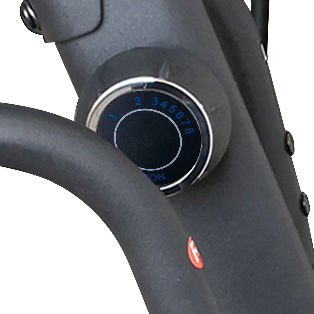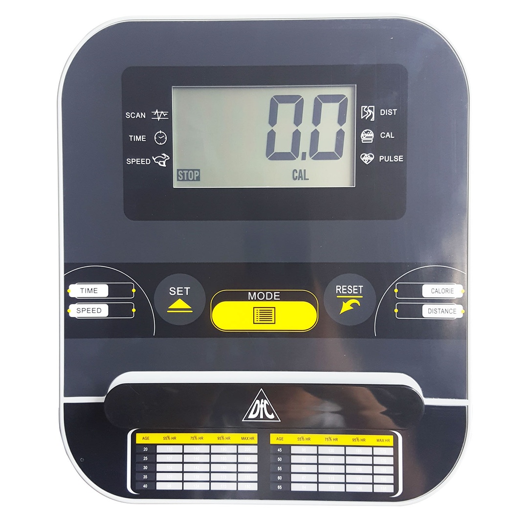 Тренажер имеет магнитную систему нагружения, с механической регулировкой нагрузки. 8 фиксируемых положений нагрузки с помощью удобной ручки на стойке тренажера. На руле расположены 2 датчика пульса с отображением показаний на дисплее консоли. Как правило, встроенные на тренажерах датчики имеют погрешность измерения. Поэтому для более точного определения частоты сердечных сокращений (ЧСС) рекомендуем использовать нагрудный кардиопояс с часами - монитором, модель DFC W117 (опция, приобретается отдельно).