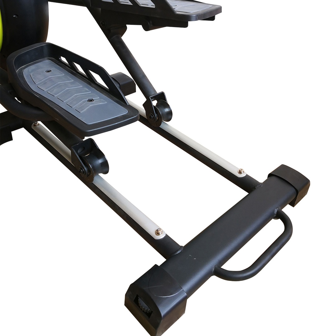 Эллиптический тренажер для домашнего использования с передним расположением маховика. Такое решение позволяет уменьшить расстояние между педалями. Движения при тренировке становятся естественными, уменьшается нагрузка на суставы. Запатентованная система двустороннего вращение маховика придает дополнительную плавность и более правильный ход педалей при занятии.