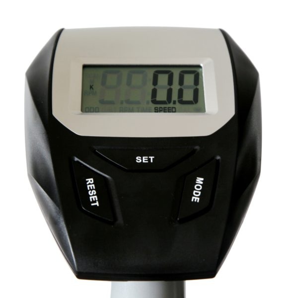 Компьютер с LCD дисплеем прост в управлении, и отображает все основные параметры тренировки – время, пройденную дистанцию, скорость, расход калорий, обороты в минуту и пульс. Сенсорные датчики съема пульса вмонтированы в поручни тренажера. Нагрузка регулируется механическим путем в 8 положениях.
