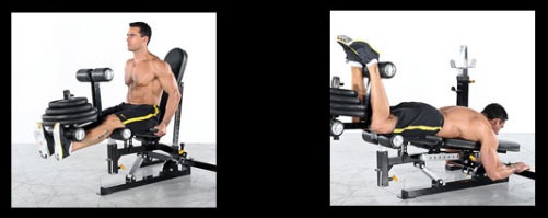 Двухпозиционная скамья для тренировки мышц ног. Позволяет выполнять сгибание ног лёжа и разгибание ног сидя. Прочный стальной профиль 2" x 3", из которого выполнена рама.