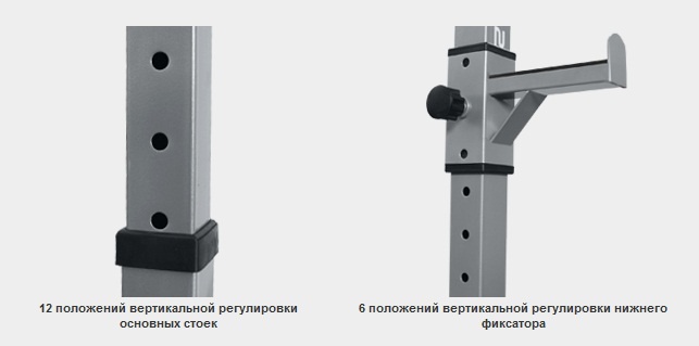 Стойка для выполнения широкого спектра упражнений со штангой. Две основные стойки регулируются по вертикали в 12-ти положениях. Кроме того, предусмотрены фиксаторы для выполнения упражнений со штангой в нижней зоне. Максимальная нагрузка - 160 кг.