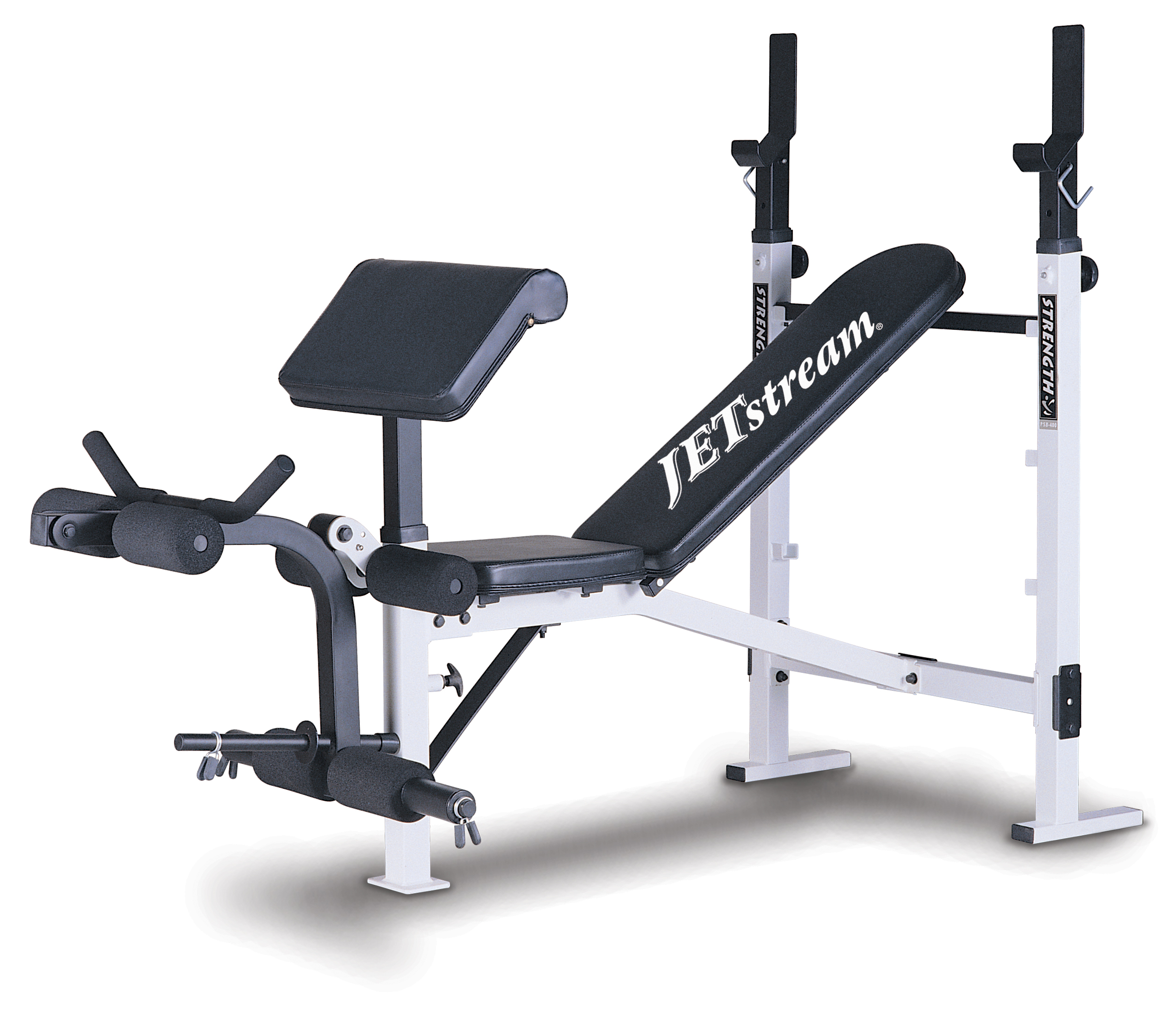 Регулируемые вертикальные стойки для штанги с крючками безопасности предотвращают спортсмена от травм во время проведения тренировки. Дополнительная парта для тренировки мышц рук разнообразит Ваши тренировки.