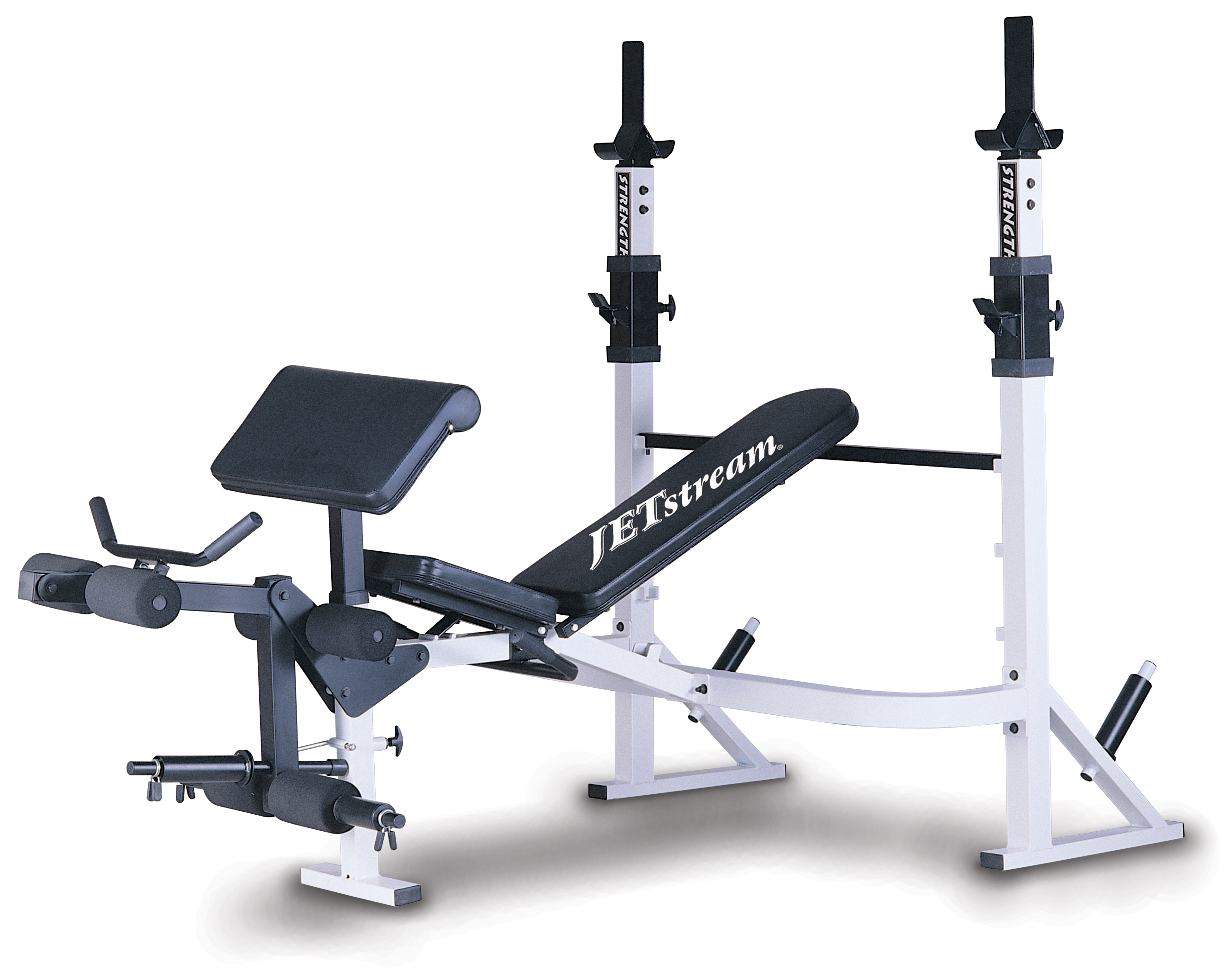 Регулируемые вертикальные стойки для штанги с крючками безопасности предотвращают спортсмена от травм во время проведения тренировки. Дополнительная парта и удобная рукоятка для прокачки бицепса разнообразит Ваши тренировки.